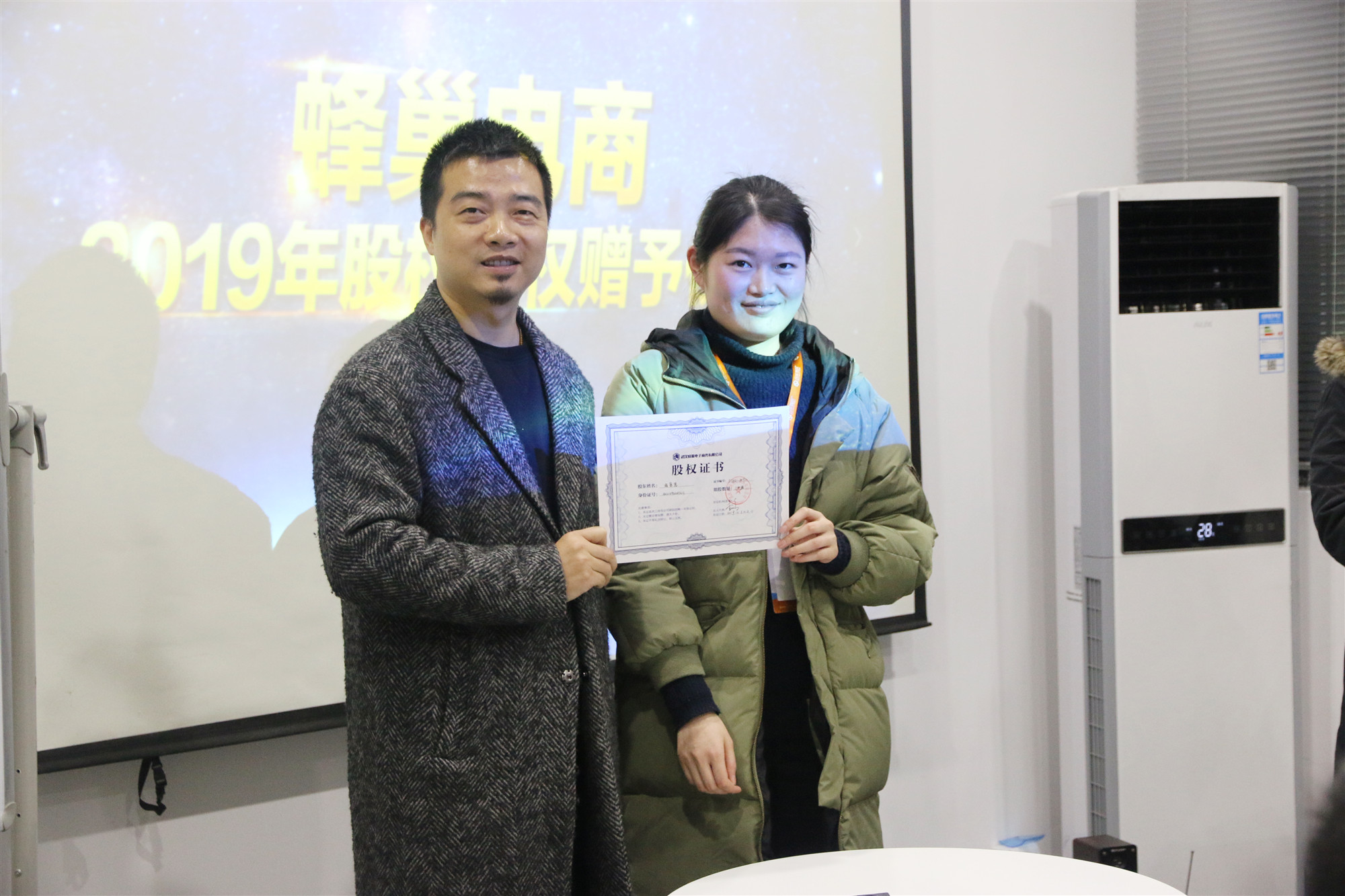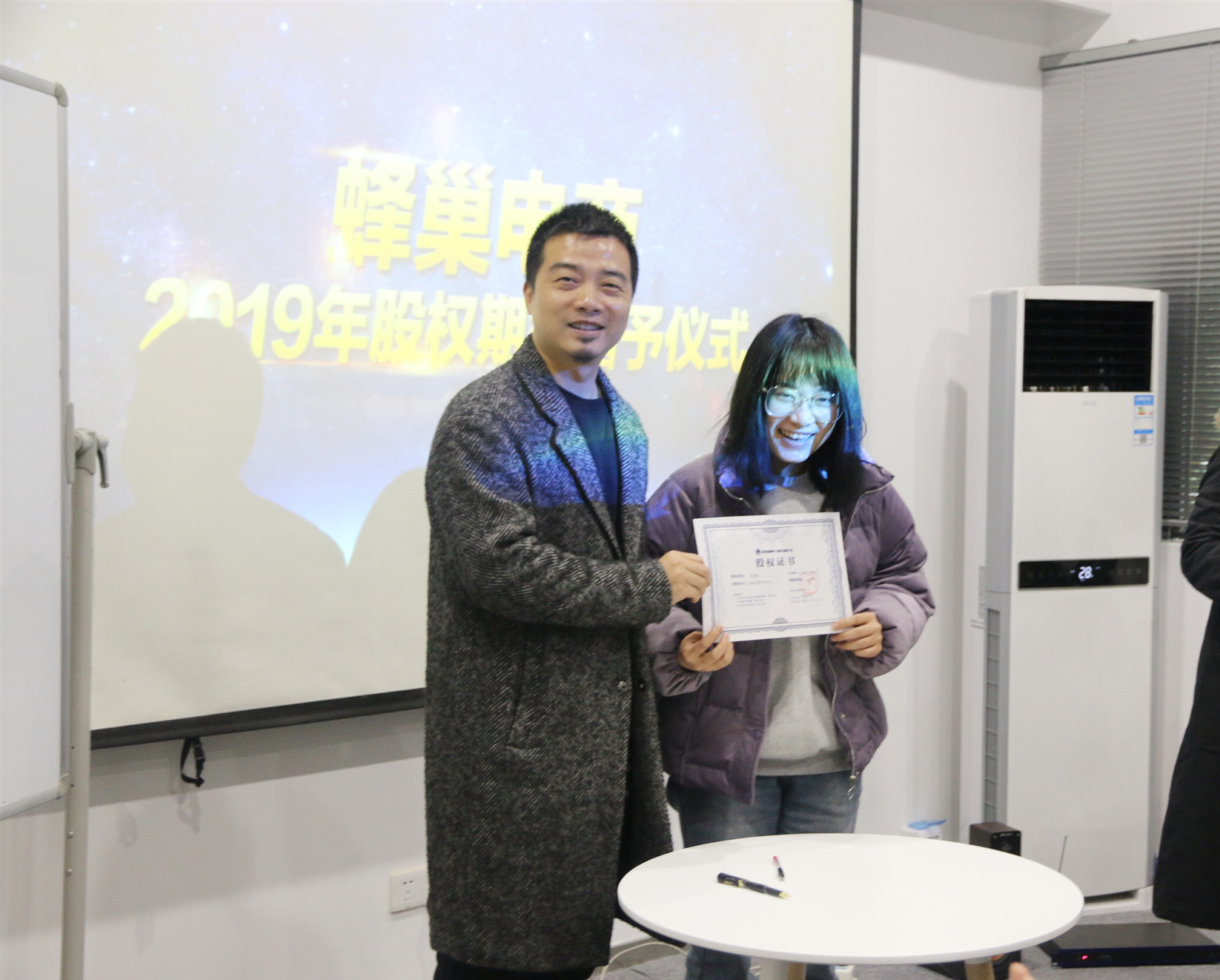 公司根据2018年的绩效考核成绩选出了第一批股权期权的获得者,并举行了赠予仪式。由莫夫为获得者颁发武汉蜂巢电子商务有限公司股权证书。后续将由公司法律顾问与获得者进行更细化的说明与签约。本次获得者有十二位分别为:财务部经理秋禾(李莉莉)、田大壮渠道拓展部经理林开(李佳佳)、心宿吾乡创意策划部高级设计师波罗(张波)、利川项目经理于果(于庆欣)、项目经理千禾(冉启芳)、利川项目运营专员千言(张邓谊)、培训部经理小宝(袁寅 )、市场拓展部专员从容(胡崇蓉)、田大专商品运营部专员万语(蔡正男)、南城项目经理春羽(孙成)、大悟项目经理杨帆(杨杨)、蕲春项目经理阿文(张炳文)。