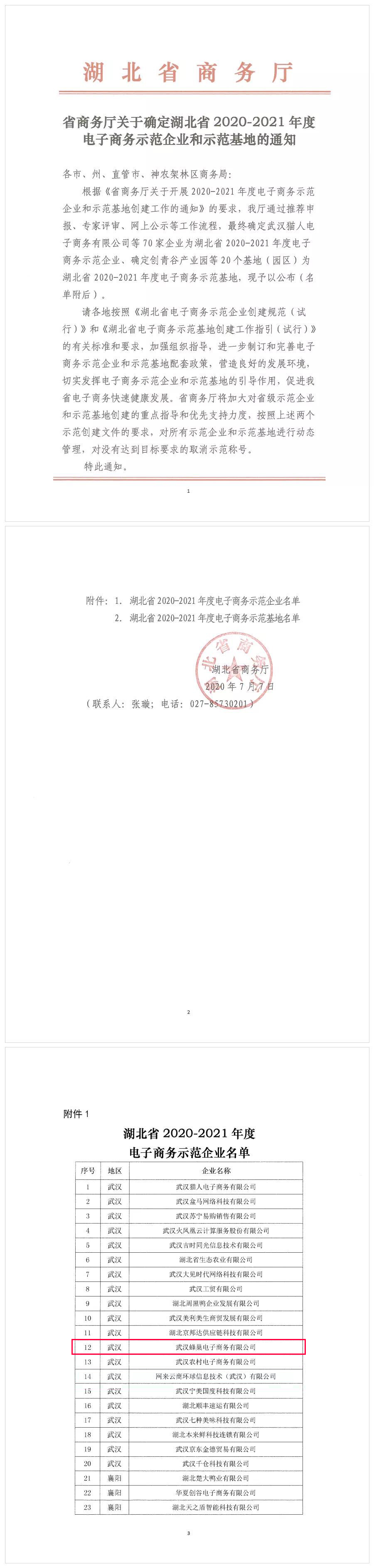 省商务厅组织专家对申报材料进行了评审。结合各地电子商务发展水平,依据专家组意见,省商务厅综合考量,遴选出2020-2021年度湖北省电子商务示范企业共70家、湖北省电子商务示范基地共20个。